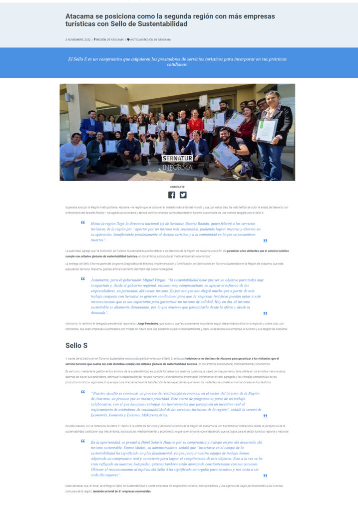Asesoría en la implementación de Sellos de Sustentabilidad Turística para 31 Empresas de la región de Atacama.